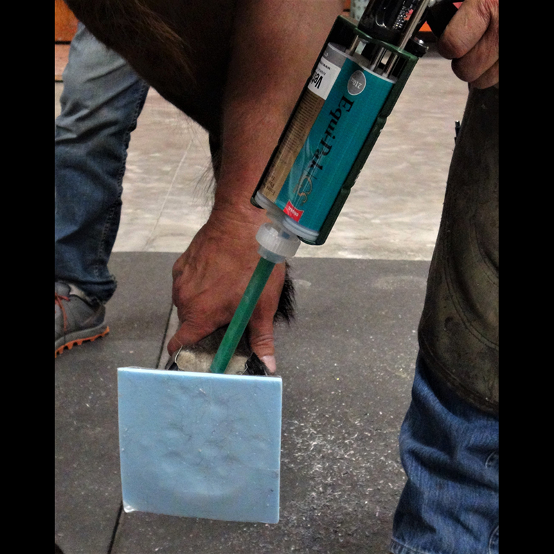 Equi-Pak CS is a copper sulfate infused liquid urethane that sets in 60 seconds and is used as a pour-in pad to provide comfort, protection and therapeutic support for equine feet. It bonds directly to the sole and frog and can be used by itself as an instant pad, or as a packing underneath a pad. Equi-Pak CS limits exfoliation, promotes sole depth and makes the bottom of the hoof impervious to injury from sharp objects.