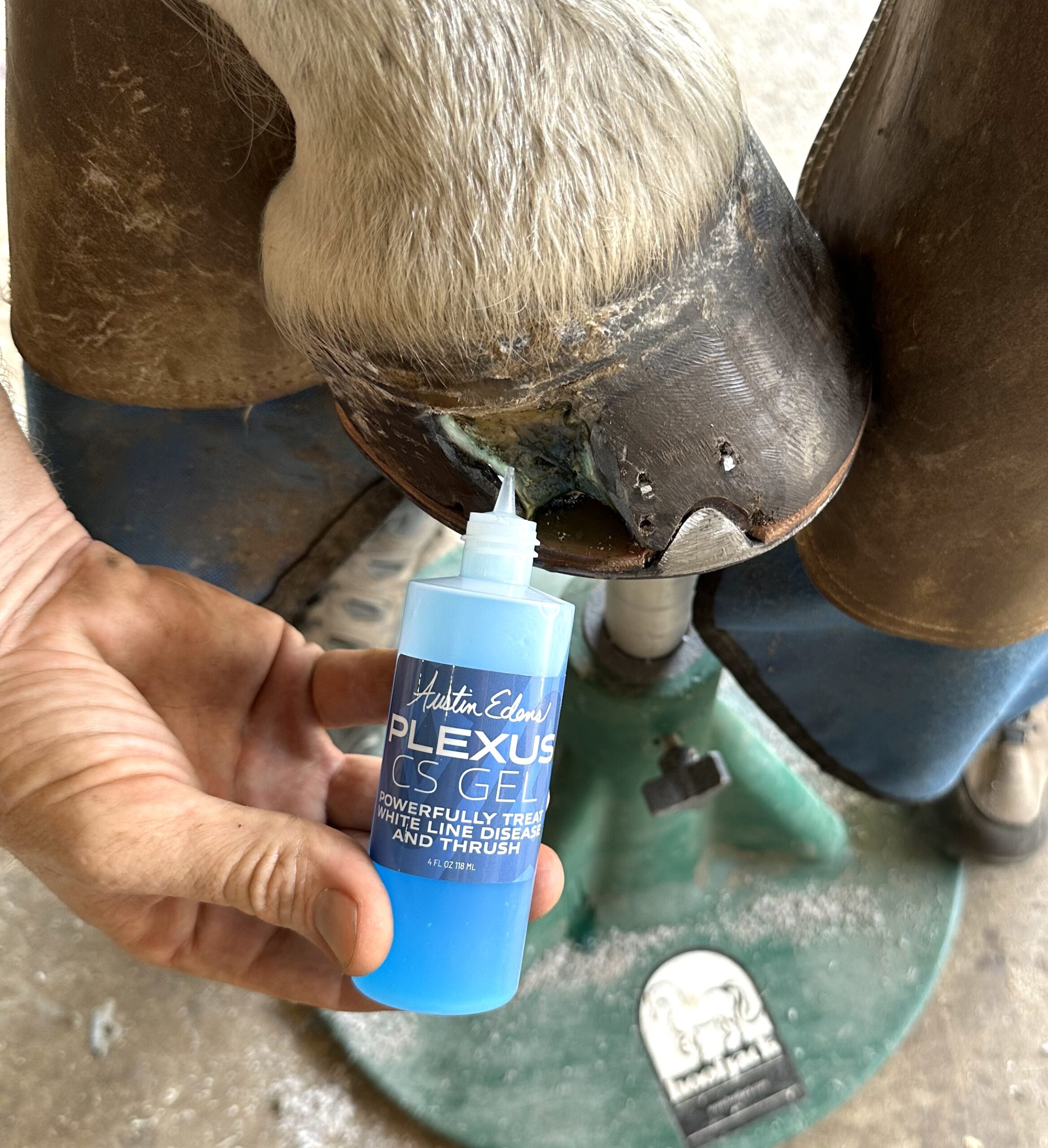 Plexus CS Gel has been developed by Austin Edens to help treat white line and other bacterial/fungal issues in the horse's foot. The gel formula contains copper sulfate and vinegar in a ratio that makes it an effective treatment and preventative product.