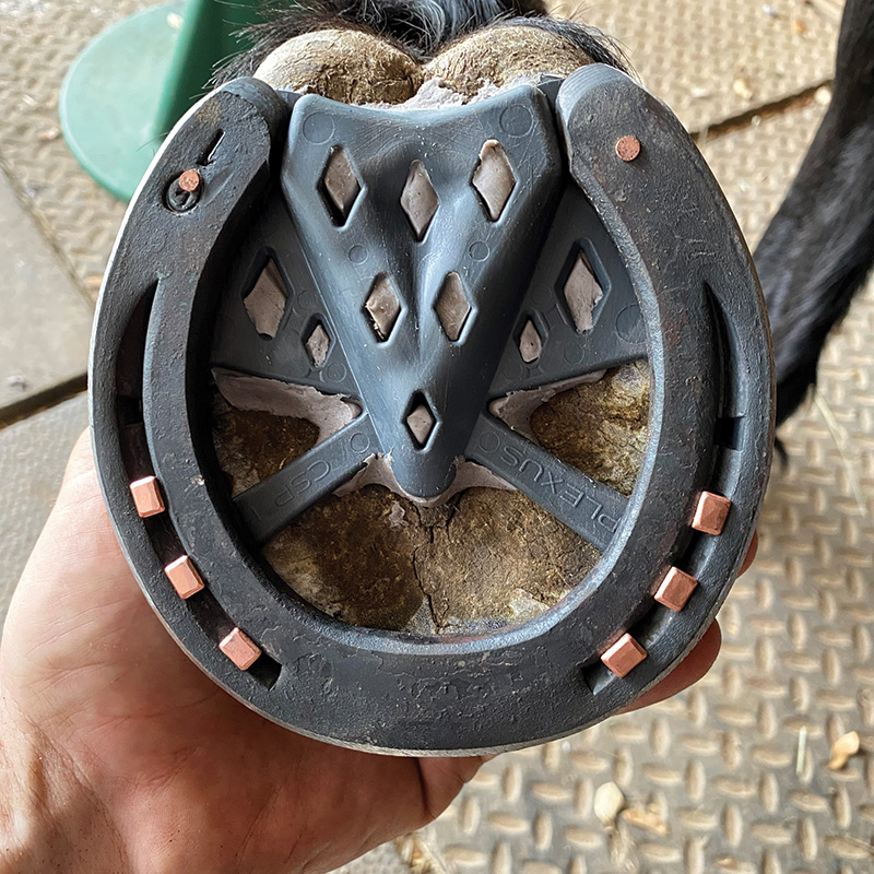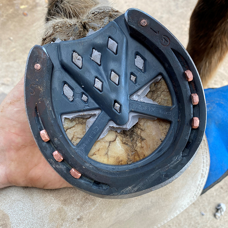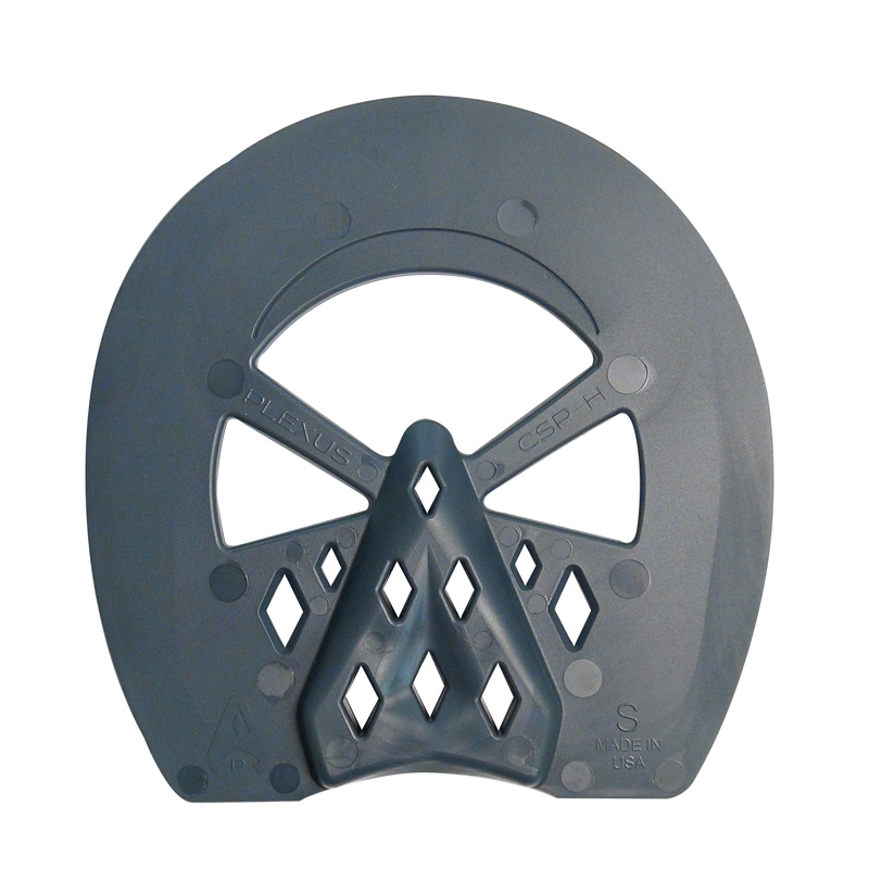 The Open Toe Caudal Support Pads feature a patent pending, versatile design. They are available in small and medium sizes. Because these pads are designed to fit both fronts and hinds, farriers will find they need to carry less inventory. The unique diamond-shaped holes provide greater locking strength for FootPro DIM and Vettec Equi-Pak. The extra length and width at the toe and heels accommodates any shaped foot and shoe modifications. Designed to provide the greatest support, the pads include a large frog plate, with heel check relief, for easy application on contracted heels. The Frog plate stabilizers will keep its tip anchored in place - even in the harshest conditions. The wedge pad also features a 3-degree wedge for help in correcting negative palmar angles and tendon issues, while maintaining caudle support.