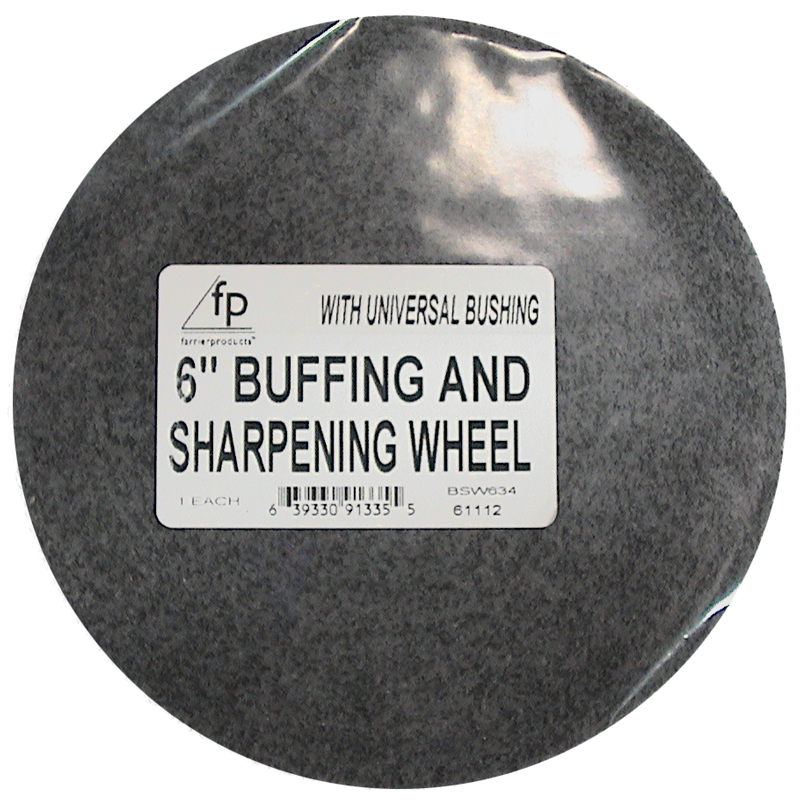 Deburring wheel embedded with silicon carbide crystals. Used for blending surfaces prior to final sharpening and removing file markings. No need to use compound. A groove can be cut into this wheel to sharpen the hook of the knife. Dimensions: 6" diameter, 3/4" thick supplied with telescoping bushing for various diameter shafts. Baldor 1/4 hp buffer operating at 1800 rpm is recommended.