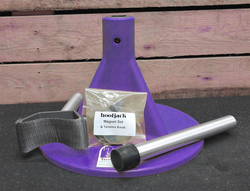 The Standard Hoofjack® Base with Accessories will accommodate a pony up to a small draft or draft cross (hooves up to a size 7). Accessories include Post with cap, Post with cradle, 2 Magnets and screws and Tension knob. Some assembly required.